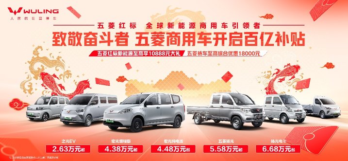 4、致敬奋斗者,五菱商用车开启百亿补贴,五菱红标新能源至高享10888元大礼,五菱货车至高综合优惠18000元。