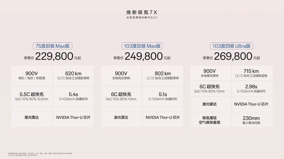 最性能的家庭豪华SUV。焕新极氪7X全系搭载900V的电机、电控和热管理系统,续航、补能、动力皆有所优化,整体实力全面领先一代。75kWh的5.5C神盾金砖电池版型,充电10min续航增加425km。103kWh的 6C麒麟电池版型,峰值充电功率高达620kW,拥有同级最快充电速度,SoC 10%至80%最快仅需10min,CLTC综合工况续航最高达到802km。四驱车型搭载高性能碳化硅电驱系统,峰值功率达到585kW,最大扭矩达到812N·m,0-100km/h加速最快仅需2.98s,最高车速达到255km/h。