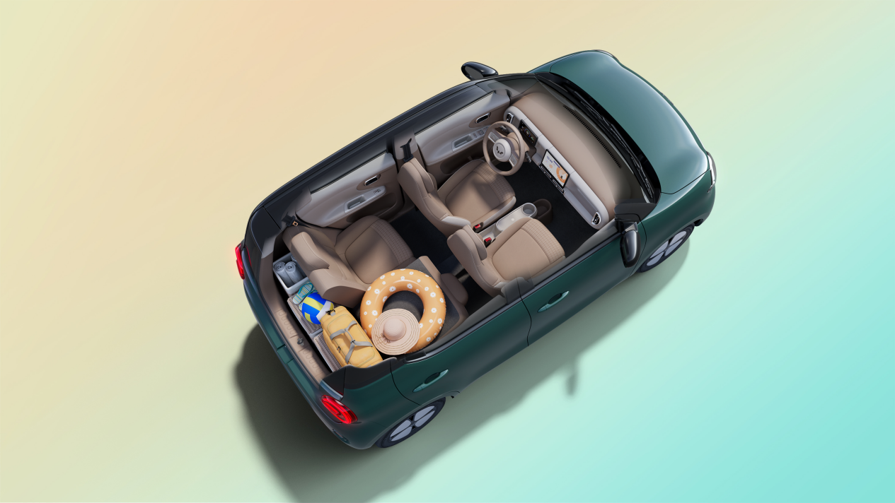 第五代宏光MINIEV以同级唯一四门四座设计,轻松打造宽适驾乘空间。新车车身尺寸3268×1520×1575mm,转弯半径仅4.5米,都市出行好开好停。为打造舒适驾乘体验,第五代宏光MINIEV前后排座间距达793mm,多人同行上下车从容自在;后排配备可视面积2016cm²电动升降车窗,视野开阔、乘坐舒心。全车座舱拥有20处实用储物空间,后备厢最大可拓展至 838L,露营装备、儿童推车均可轻松收纳。