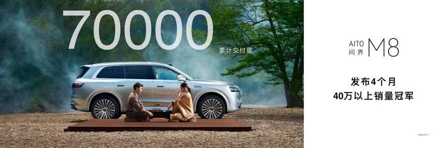问界 M8 自发布以来,累计交付超 7 万辆,上市 4 个月蝉联 40 万级销量冠军,广受用户喜爱与认可。随着问界M8纯电版上市,将进一步扩充问界家族产品矩阵,满足用户多元化购车需求,并继续巩固问界品牌的市场领导地位。