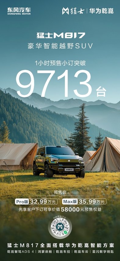 东风猛士科技与华为自签约以来,合作迅速开花结果。2025年4月22日,双方联合推出的“豪华智能越野SUV”猛士M817迎来全球首秀;7月17日,猛士M817开启预售,取得1小时9713台的预售战绩;8月17日,猛士M817上市以来,销量持续火爆,同时口碑还获得同级车第一,实现销量口碑双丰收。