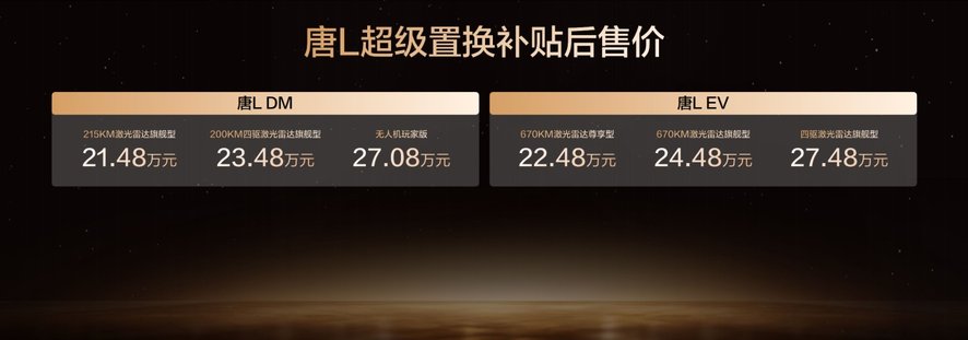 此次,唐L EV 3款车型,补贴后售价22.48万~27.48万元;唐L DM 3款车型,补贴后售价21.48万~27.08万元;同时,比亚迪还为用户准备了包含置换补贴在内的至高价值4.5万元尊享礼遇,让旗舰体验触手可及。