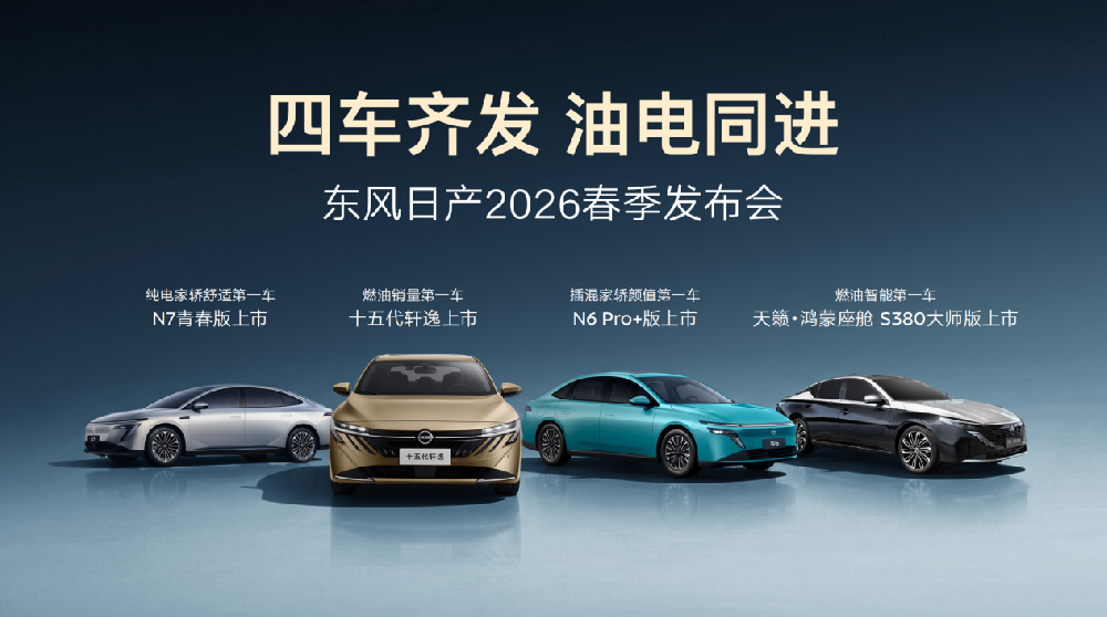 2月24日,“四车齐发,油电同进”东风日产2026春季发布会盛大举行,十五代轩逸、天籁·鸿蒙座舱S380大师版、N6 180 Pro+版、N7青春版等四款新车正式上市。其中,十五代轩逸推出3款车型,上市限时价9.49万元-10.99万元;天籁·鸿蒙座舱S380大师版上市限时价16.19万元;N6 180 Pro+搭载宁德时代电池和Momenta高阶智驾,上市限时价11.19万元;N7全系焕新青春版,上市限时价10.99万元-13.99万元。